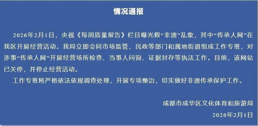 通报称,2月1日,央视《每周质量报告》栏目曝光假“非遗”乱象,其中“传承人网”在我区开展经营活动。我局立即会同市场监管、民政等部门和属地街道组成工作专班,对涉事“传承人网”开展经营场所检查、当事人问询、证据封存等执法工作。目前,该网站已关停,并停止经营活动。