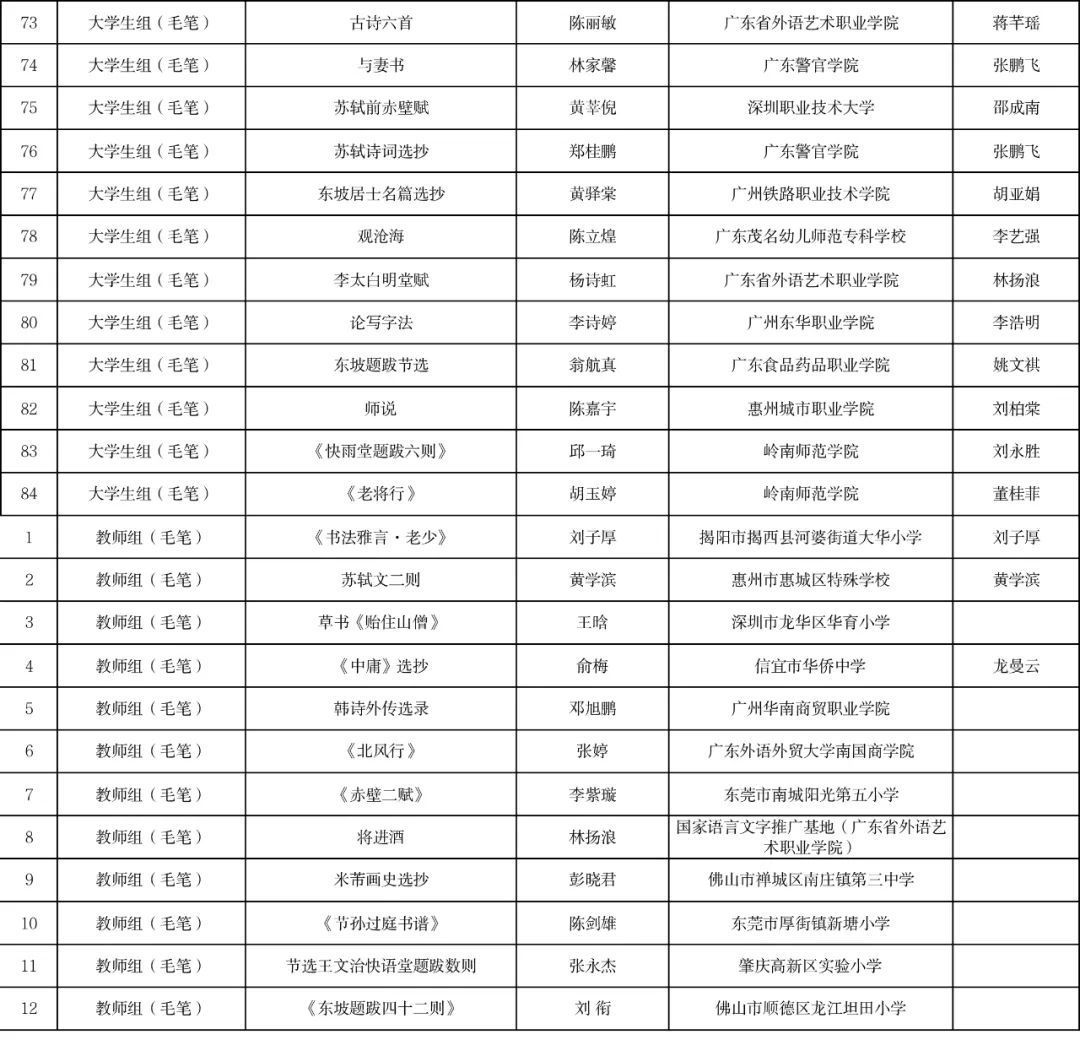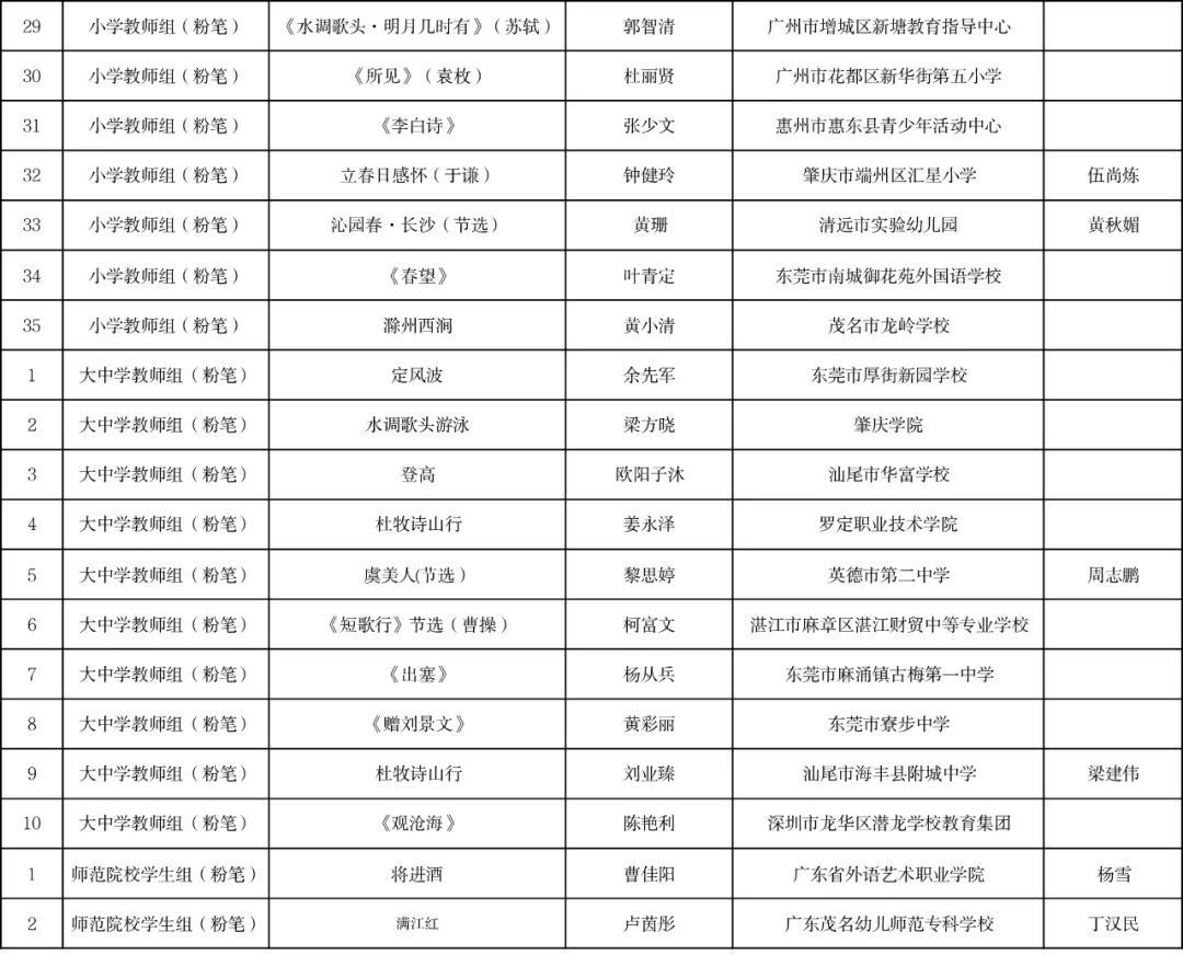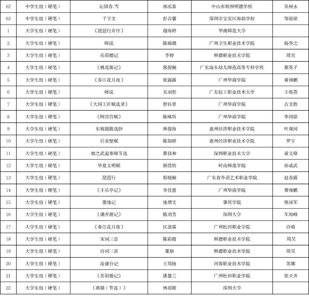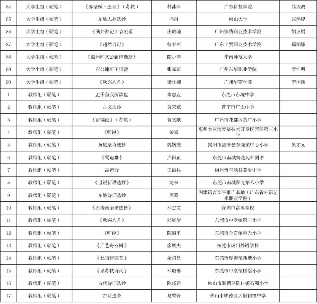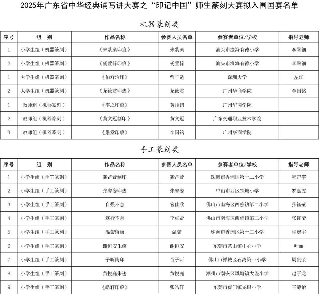 根据教育部、国家语委要求,截至各赛项截止日期,经过各单位初赛遴选,广东省各地市、各高等院校、省属中等职业学校、省属中小学校共推荐诵读大赛有效参赛作品(视频)1080个,讲解大赛有效参赛作品(视频)1025个,书写大赛有效参赛作品 4381个,篆刻大赛有效参赛作品830个。经过评审专家组公平、公正、严格的评审,现将2025年广东省中华经典诵写讲大赛拟入围国赛及省决赛名单面向社会公示。公示期自2025年7月1日至2025年7月5日,共五天。