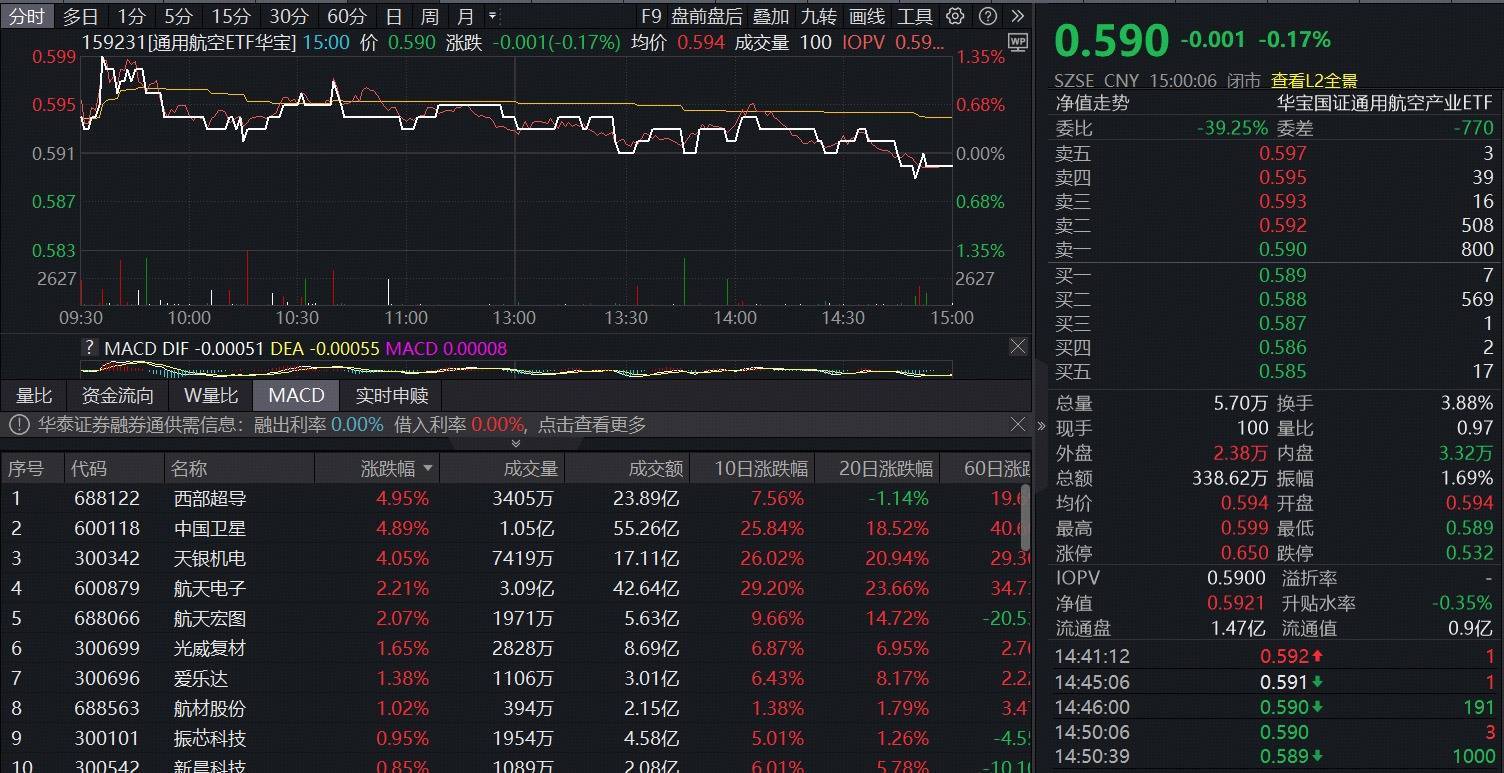 成份股方面,西部超导、中国卫星、天银机电涨超4%居前;广电计量、英搏尔跌超4%,天和防务、晨曦航空跌超3%。万丰奥微、航天彩虹、应流股份等主要权重股跌幅均在1%左右。