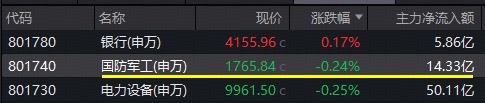 大市放量调整,国防军工板块逆市活跃,尽管尾盘翻绿,不过行业表现、主力净流入额均高居全行业(申万)第二。